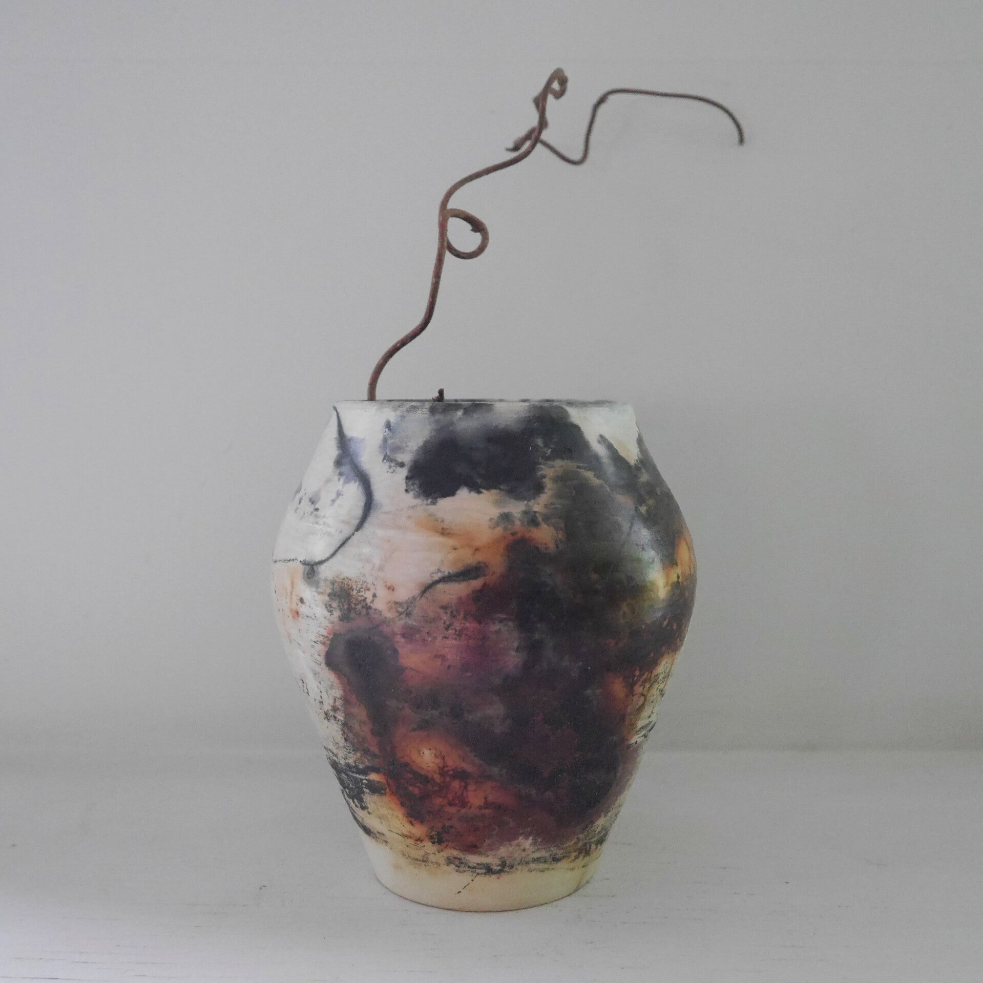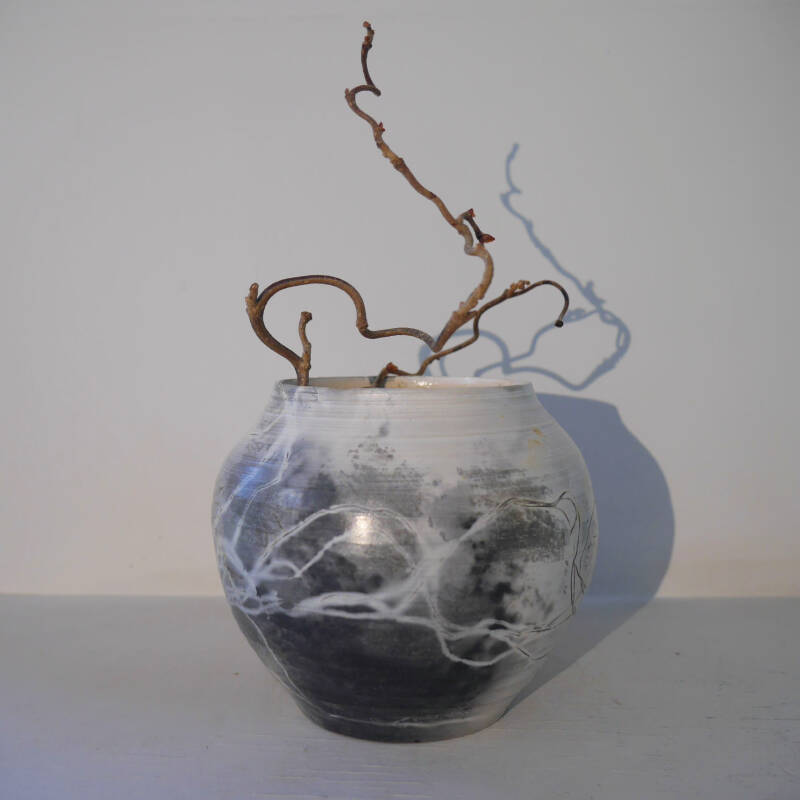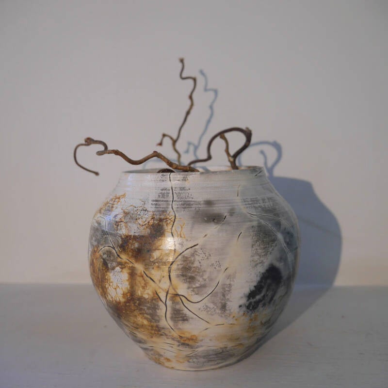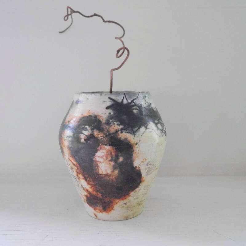 ENGLISH Technique: First I roll the stoneware clay and put the parts together. When leatherhard I polish with a stone so that the surface is shiny. When it is completely dry I apply 3 layers of Terra sigillata and polish again. Then bisquefired to 950 gr. Now I add copper wire, iron oxide, banana peel, metal mesh, pine needles and so on, to the pot and put it in a saggar/container with different combustible materials. Back into the kiln with the lid on the saggar and let the fire create the pattern. This makes each one completely unique. Afterwards I polish again after washing off the fire residues.