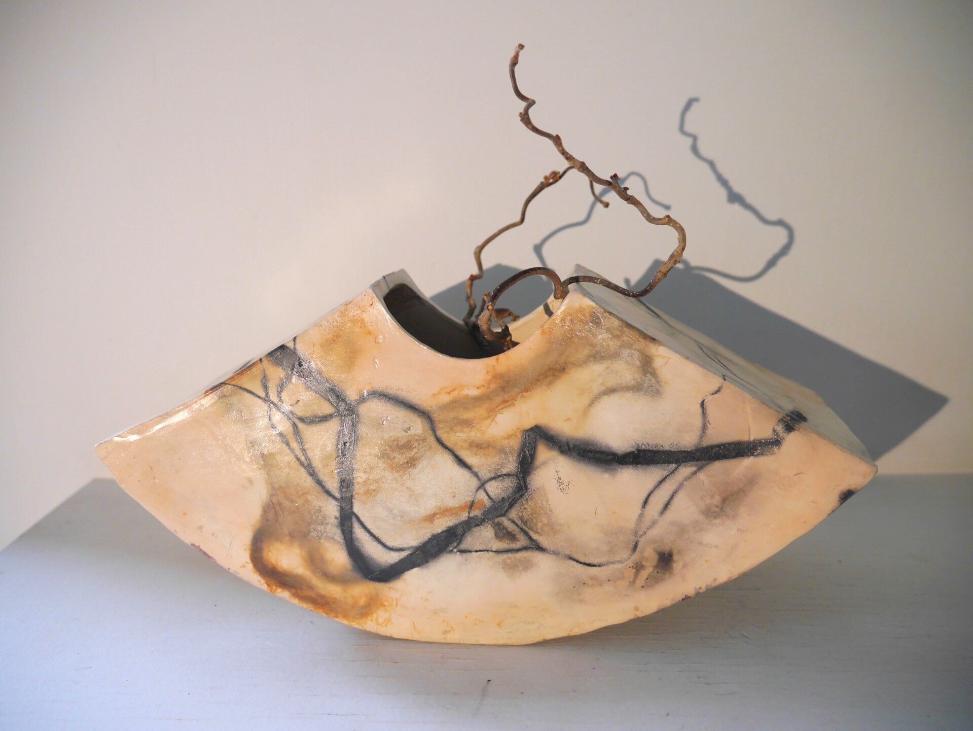 Först kavlar jag stengodsleran och sätter ihop delarna, sen polerar jag med en sten så den blir blank. När den torkat helt så lägger jag på 3 lager av Terra sigillata och polerar igen. Sen skröjbränds den i ca 950 gr. Sen lägger jag den i en saggar/behållare med olika brännbara material, samt lägger på koppartråd ( som du ser som svarta linjer) , svinto, järnoxid, bananskal, metallnät, tallbarr mm. Så in i keramikugnen med lock på och låter elden skapa mönstret. Detta gör att alla blir helt unika . Sen polerar jag igen efter att jag tvättat av eldresterna.