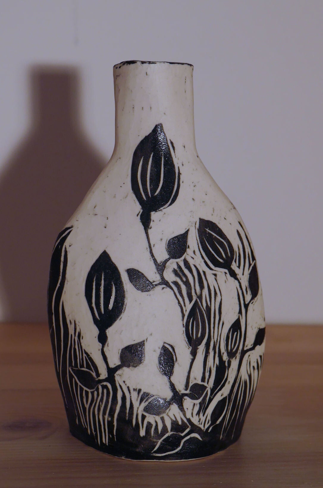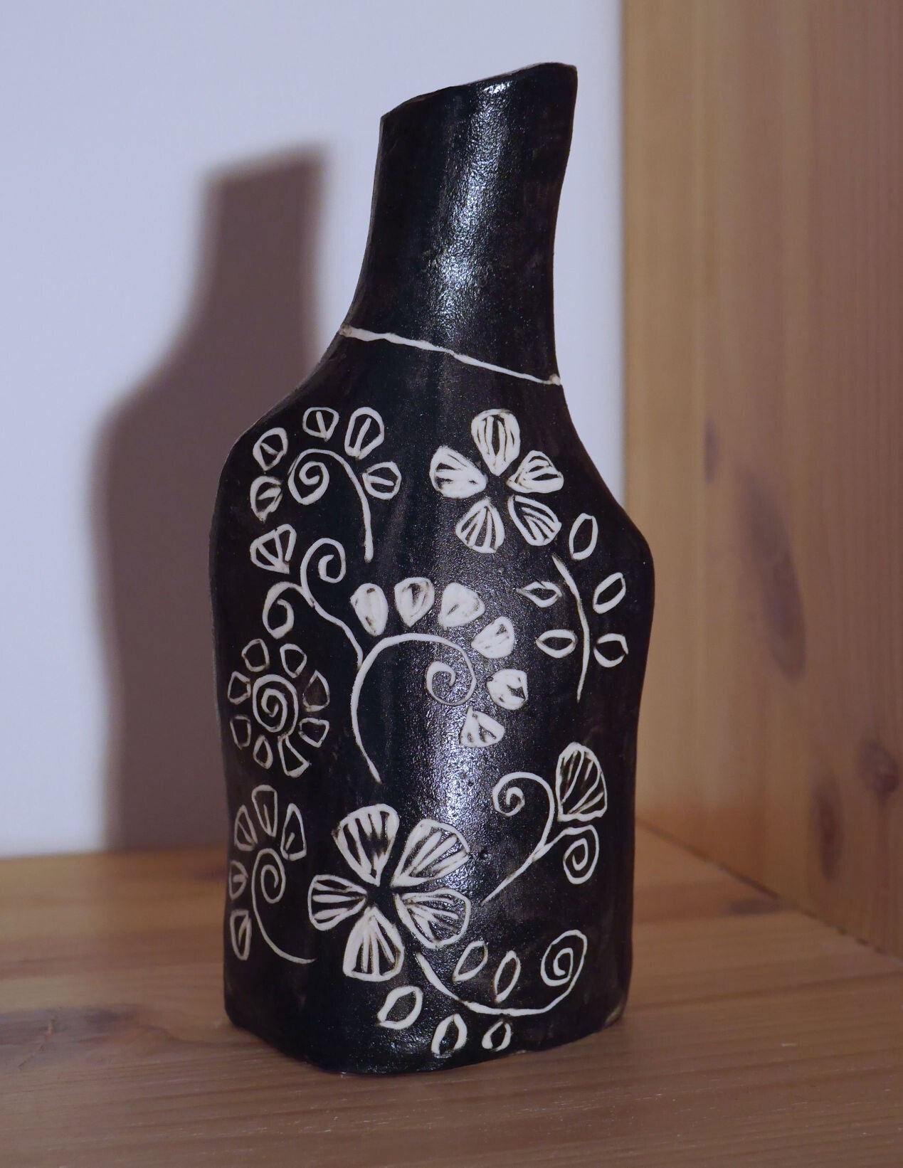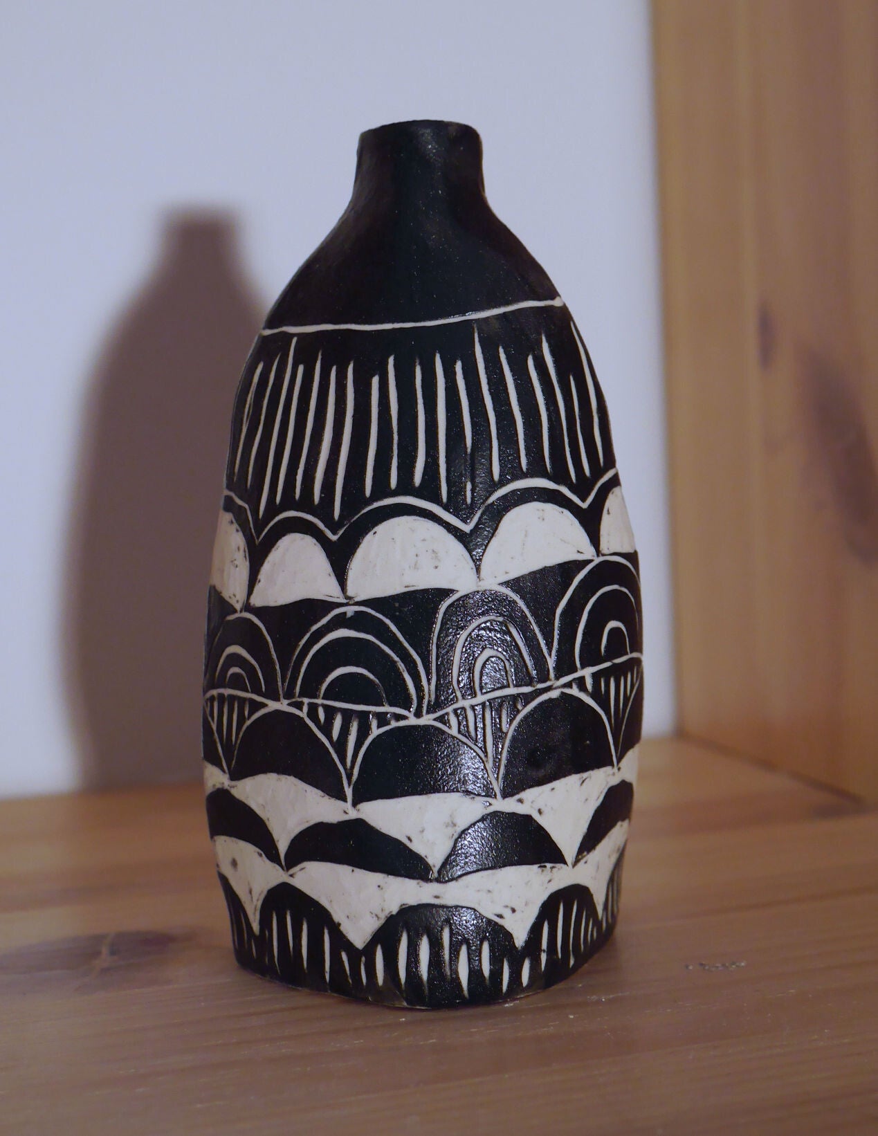 Dessa små vaser är handkavlade och målade med en svart engobe. Därefter skrapar jag fram designen som jag hittar på själv.