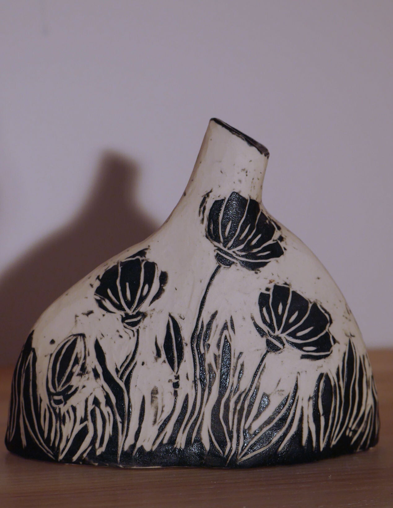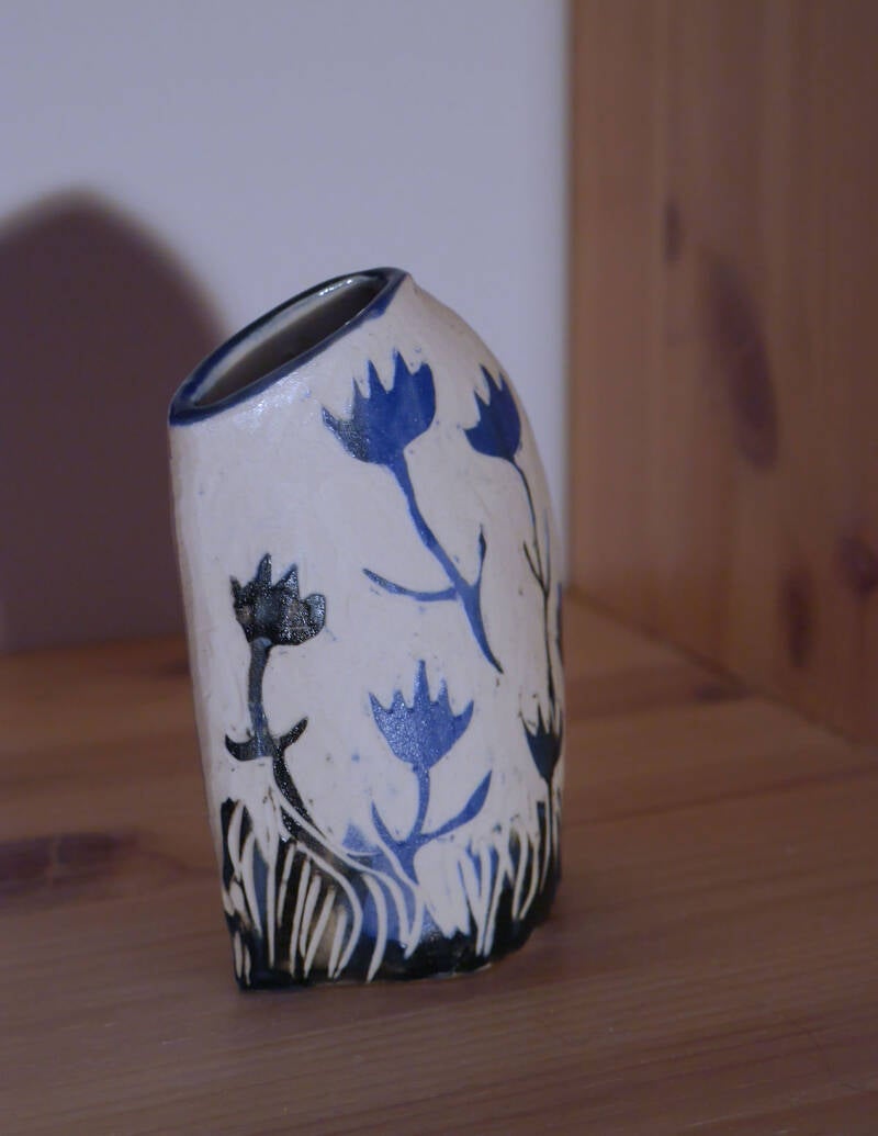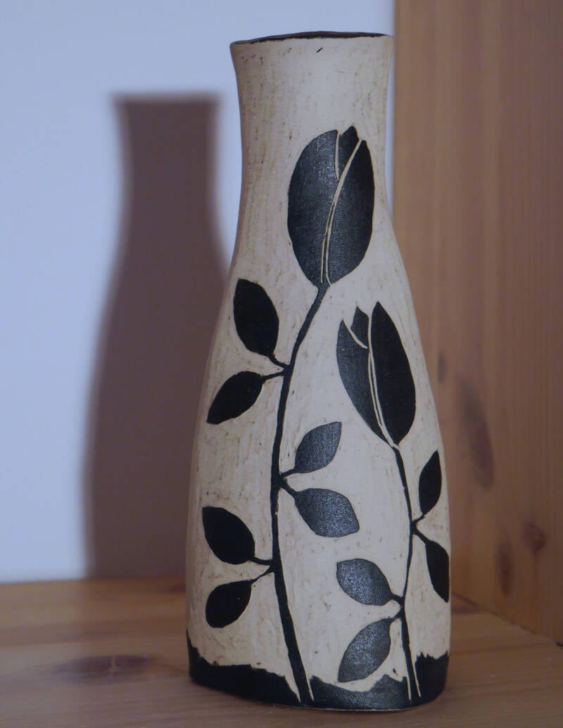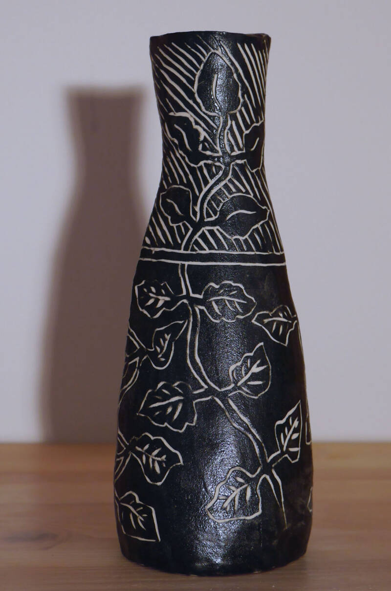Dessa små vaser är handkavlade och målade med en svart engobe. Därefter skrapar jag fram designen som jag hittar på själv.